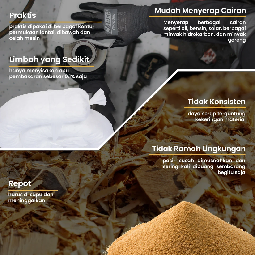 4. Cocok menyerap berbagai oli (mesin, hidrolik, transmisi dan cutting fluid), bensin, solar dan berbagai minyak hidrokarbon, dan minyak goreng serta nabati lainnya.