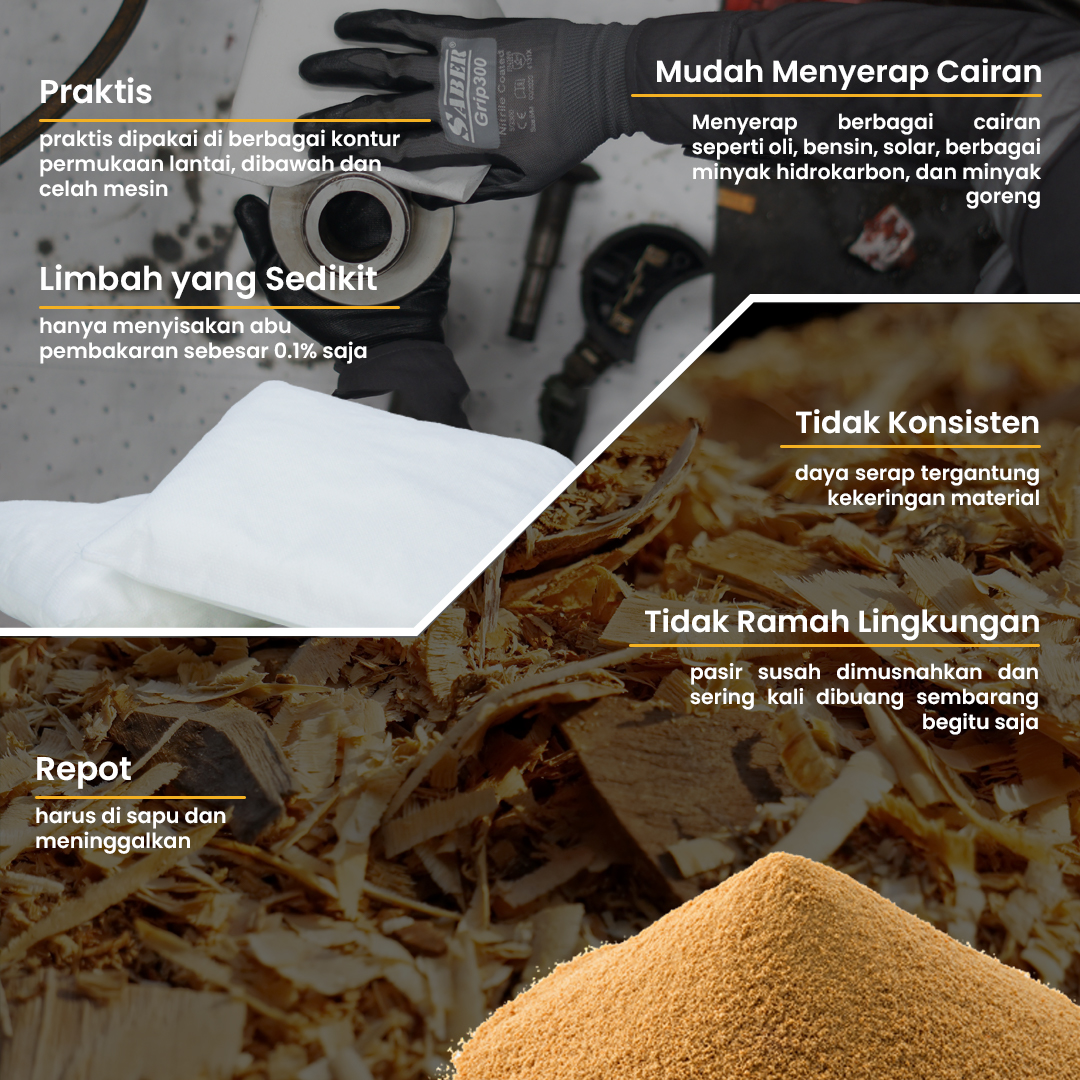 3. Cocok menyerap berbagai oli (mesin, hidrolik, transmisi dan cutting fluid), bensin, solar dan berbagai minyak hidrokarbon, dan minyak goreng serta nabati lainnya.